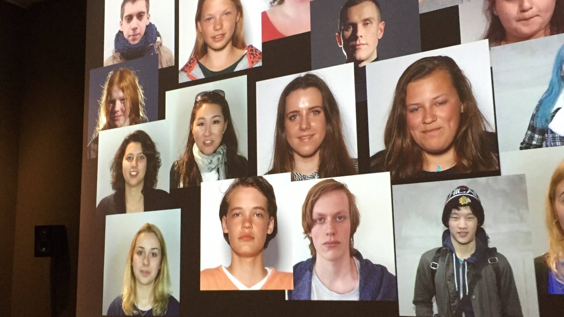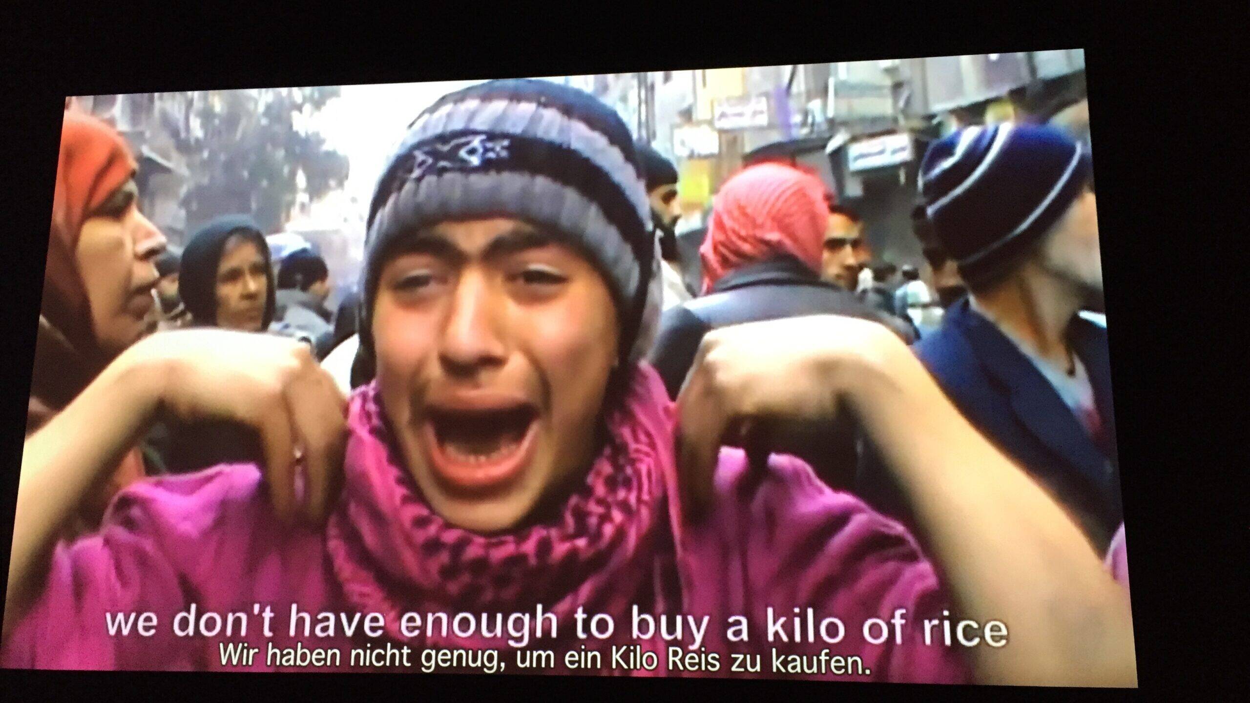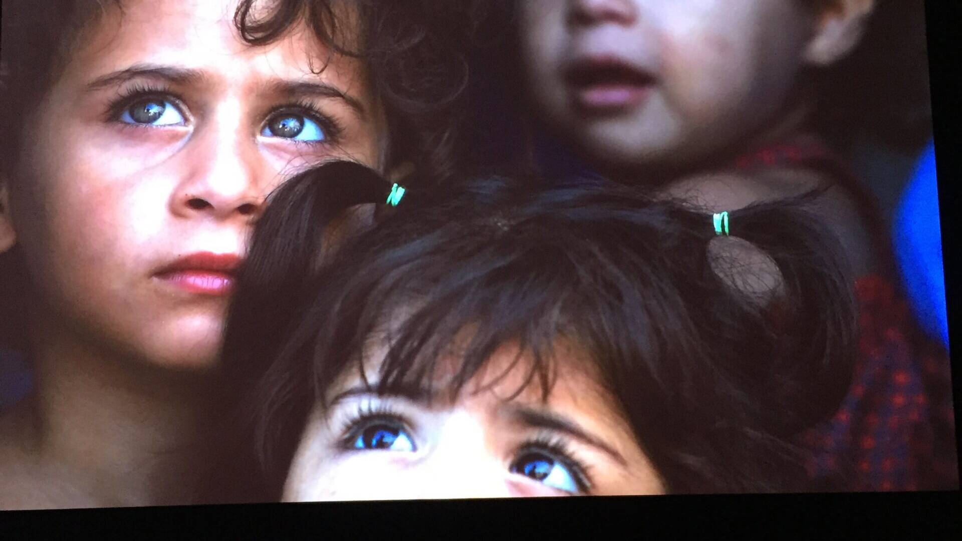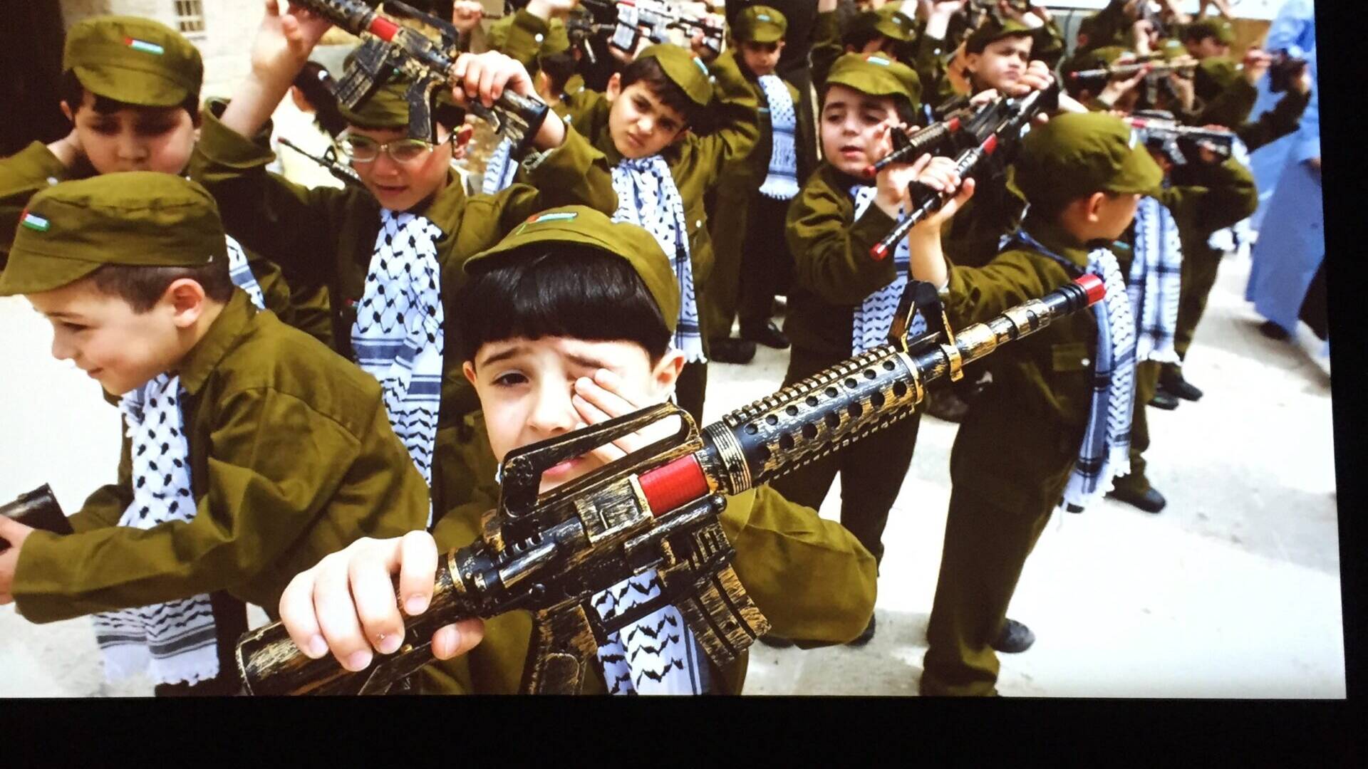 Diğer duvarda kısa kısa sahneler: Filistin’de kamptaki bir çocuk konuşuyor: “Çok güvenli yerde yaşardık. Burası çok soğuk” “Uçaklar bizi avlıyor, o yüzden göç ettik” “Bir kilo pirinç alacak paramız yok” “Burada su dolduruyorduk. Biz onlara ne yaptık ki?”. Dünyanın dört bir tarafından ellerine silah verilmiş, yaralanmış, öldürülmüş bebekler, çocuklar. Afrika, Ortadoğu, Güney Amerika.