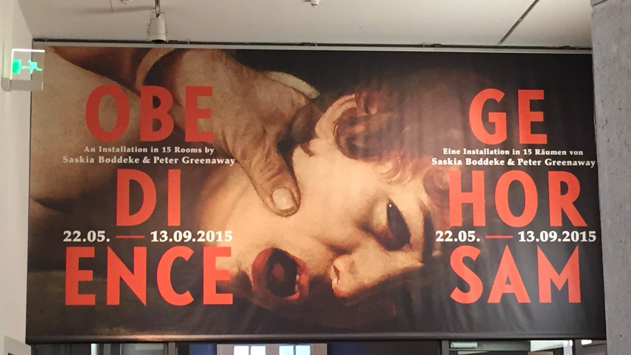 Saskia Boddeke ve Peter Greenaway’in birlikte yarattığı “İtaat” sergisi için müzenin en üst katında yer ayrılmıştı. Ünlü film yönetmeni Peter Greenaway’in ismini gördüğüm için, bir filmin oynadığı ilk odaya girince serginin orada biteceğini düşündüm. Zaten Berlin’deki son günümdü ve pek zamanım yoktu. Hatta o güneşli havada son günümü kapalı bir yerde geçirmekle hata yaptığımı bile düşünüyordum.