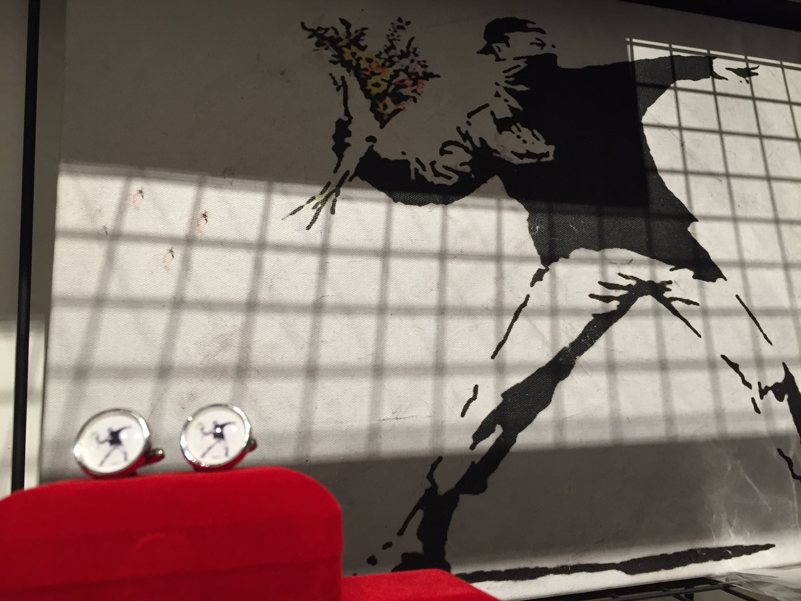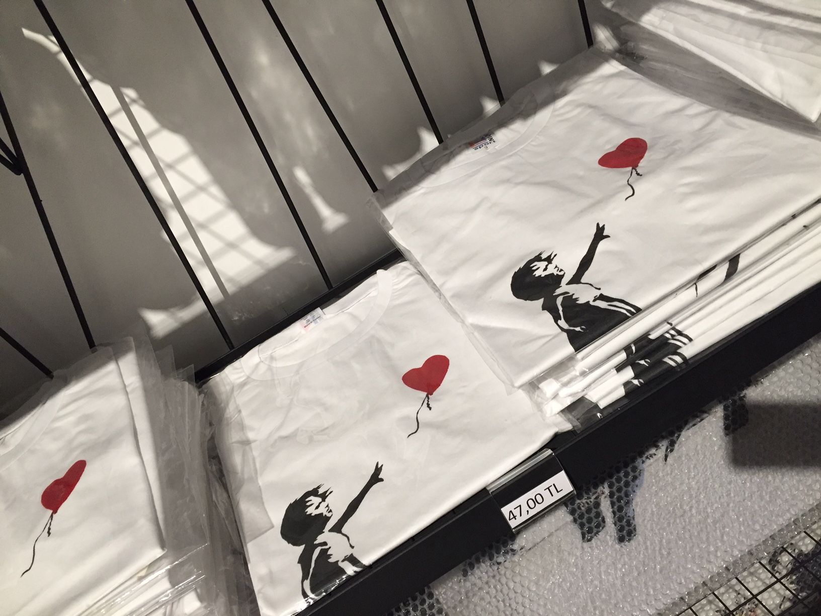 Diğer taraftan serginin sonunda bu kadar muhalif, İsa’nın bile alışveriş poşetleri ile resmini yapan, en önemli eserleri kapitalizmin olumsuz etkilerini eleştiren bir sanatçının, tişört, kalemlik, tabure vs hatıralık eşyalarının bulunması; hatta en ünlü eserlerinden birini ‘kol düğmesi’ şekline bürünmüş görmek içimi cız ettirdi. Sonra bir önceki yazımda söz ettiğim ünlü Ortaçağ sanatçısı Bosch’un cenneti anlatan tablosunun çorap olduğunu anımsayınca, beterin beteri var diye düşündüm. Neyse ki, en azından Bosch bu günleri görmedi!