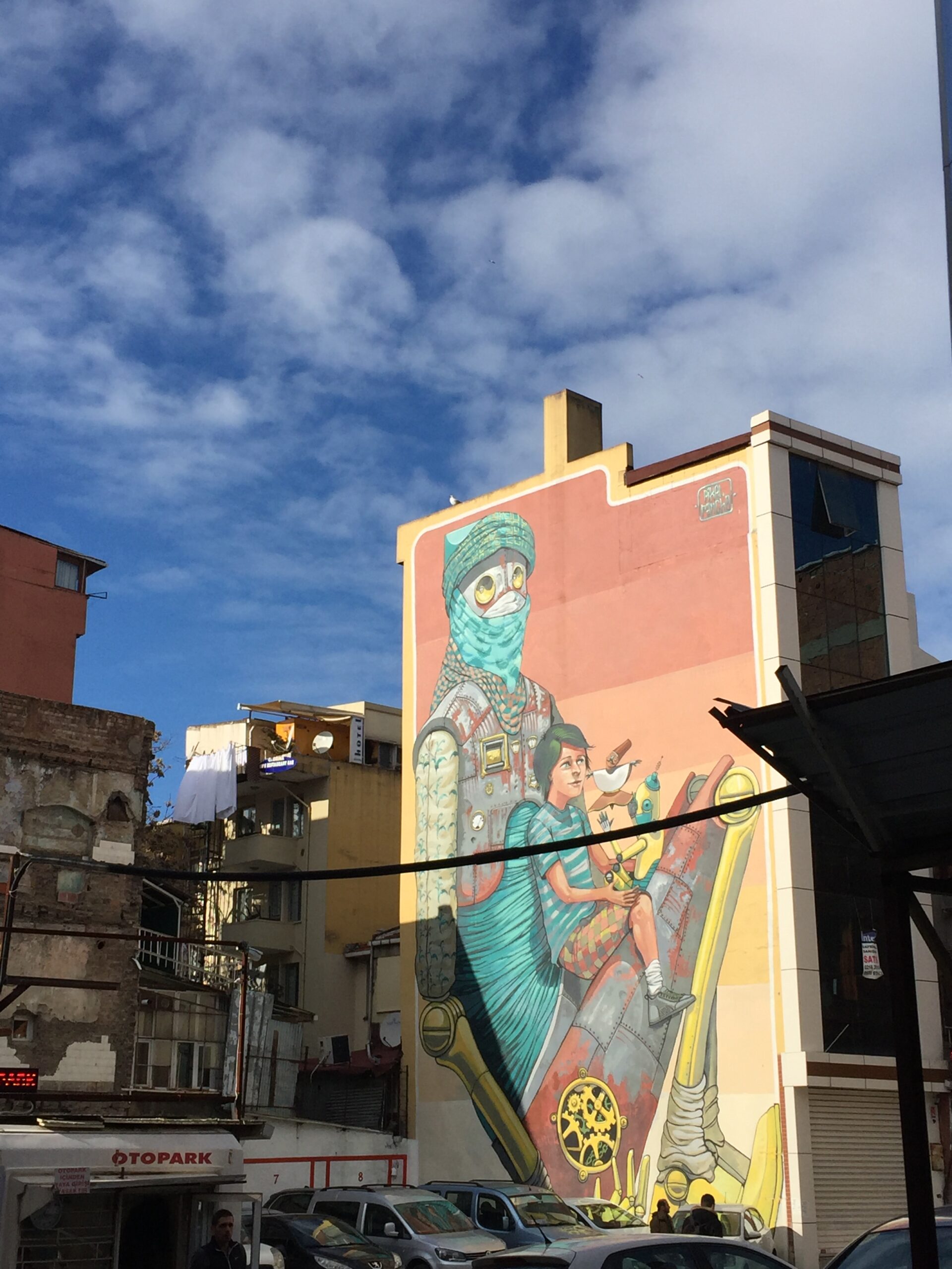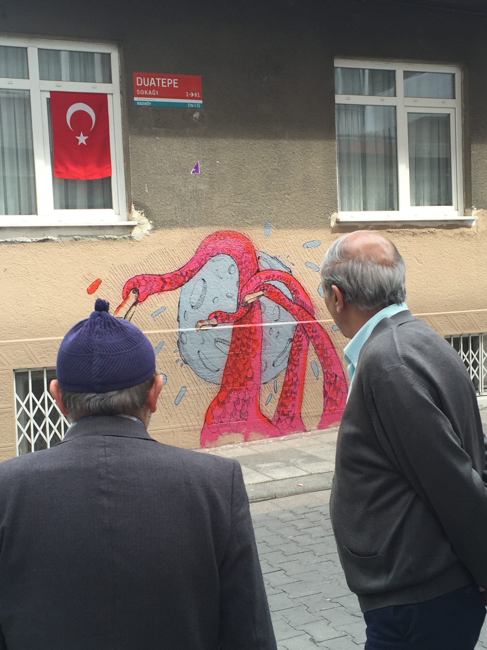 Duatepe’de yeni yapılan bir duvar resmini ahali değerlendiriyor. Kısa bir süre içinde boyayla üstü kapatılacaktır bu resmin.